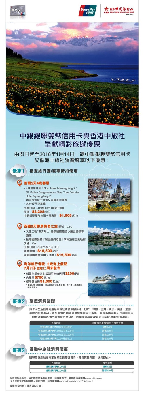 中銀銀聯雙幣信用卡客戶尊享香港中旅社精彩旅遊優惠
