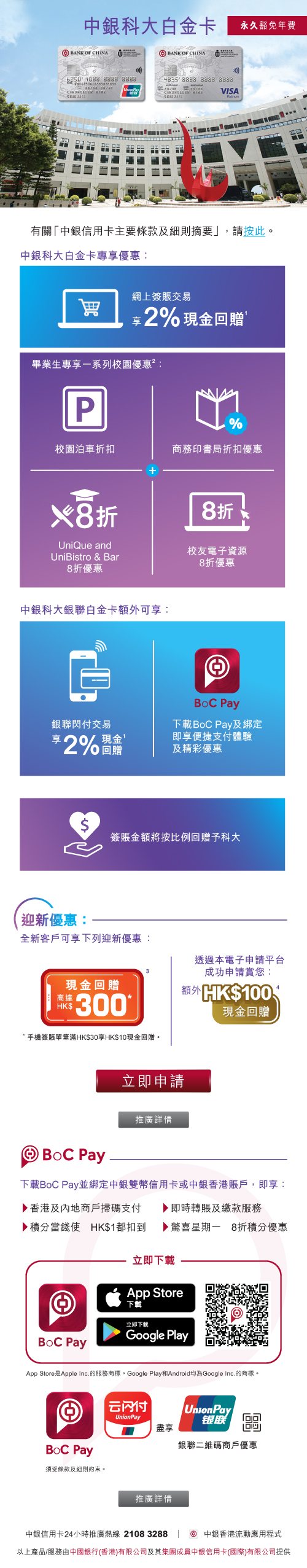 1.每位客户(以每个卡账户计算)每月最高可获HK$100现金回赠,以每月第一天至最后一天计算。2.详情请参阅香港科技大学网页。3. 迎新优惠适用于申请日期前12个月内并未曾取消或持有任何中银信用卡之客户及须符合签账要求。4.额外HK$100现金回赠只适用于透过电子平台申请及于申请日期前12个月内并未曾取消或持有任何中银信用卡之客户。