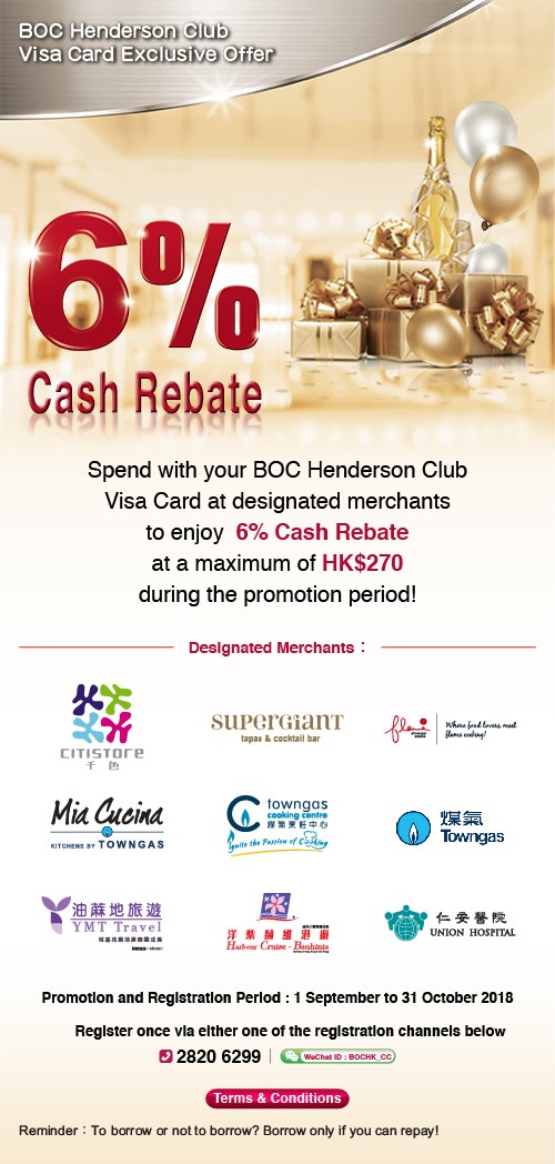 6% Cash Rebate for BOC Henderson Club Visa Cardholders