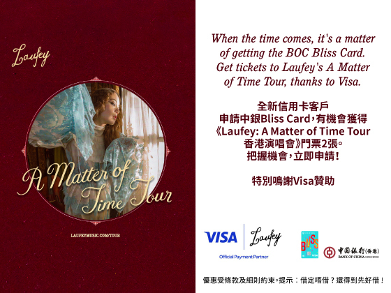 发卡当月及其后的首两个历月内累积零售签账满HK$12,000,有机会获得《Laufey: A Matter of Time Tour 香港演唱会》门票2张!