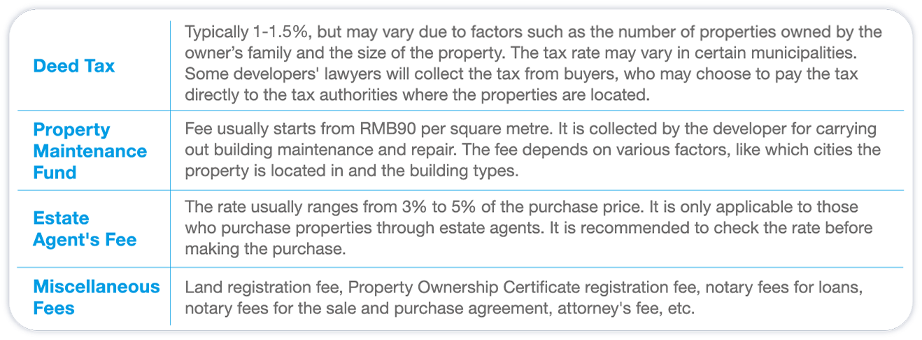 In the mainland, the following taxes and miscellaneous fees must be paid in addition to the price for property purchases: