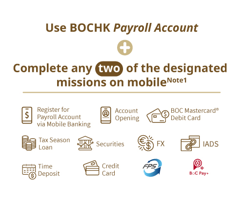 Complete any TWO of the following items via BOCHK Mobile Banking: (1)Register for Payroll Account (2)New customers open an account via BOCHK Mobile Banking Application (“QR Account Opening” at branches with mobile phones is excluded) (3)Foreign Currency Exchange (4)Successfully opened BOC Mastercard® Debit Card and made at least 1 transaction (5)Buying/Selling Securities (6)Place Time Deposit (7)Successfully granted with BOC Express Cash Instalment Loan – Tax Season Loan (8)Successfully applied and granted with BOC Cheers Card or BOC Chill Card or BOC Go Card (9)Grant IADS consent, authorize to view other banks account (10)Successfully set BOCHK account as the FPS Default Account (11)Successfully registered BoC Pay+ and hold Pay+ Wallet or Pay+ Wallet Lite for the first time