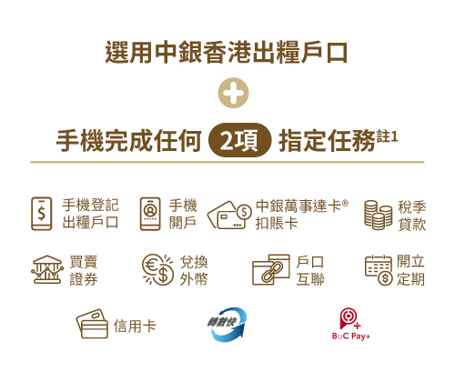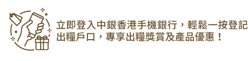 - 瀏覽人士使用中銀香港流動應用程式或網上/手機銀行即表示同意中銀香港於流動應用程式或網上/手機銀行不時所載之免責聲明及政策。