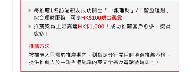 中银香港访港亲友推荐计划,齐齐有福同享。 推广期内经中银香港指定分行开立中银理财或智盈理财账户可享丰富迎新优惠,若同时开立证券账户可享佣金低至HK$0优惠! 只要开立指定账户时在推荐表格填我的英文全名及电话号码,我亦可享推荐奖赏。大家有福同享! 投资涉及风险,受条款约束。 http://www.bochk.com/dam/document/investment_services/family_mgm/popup_sc.html