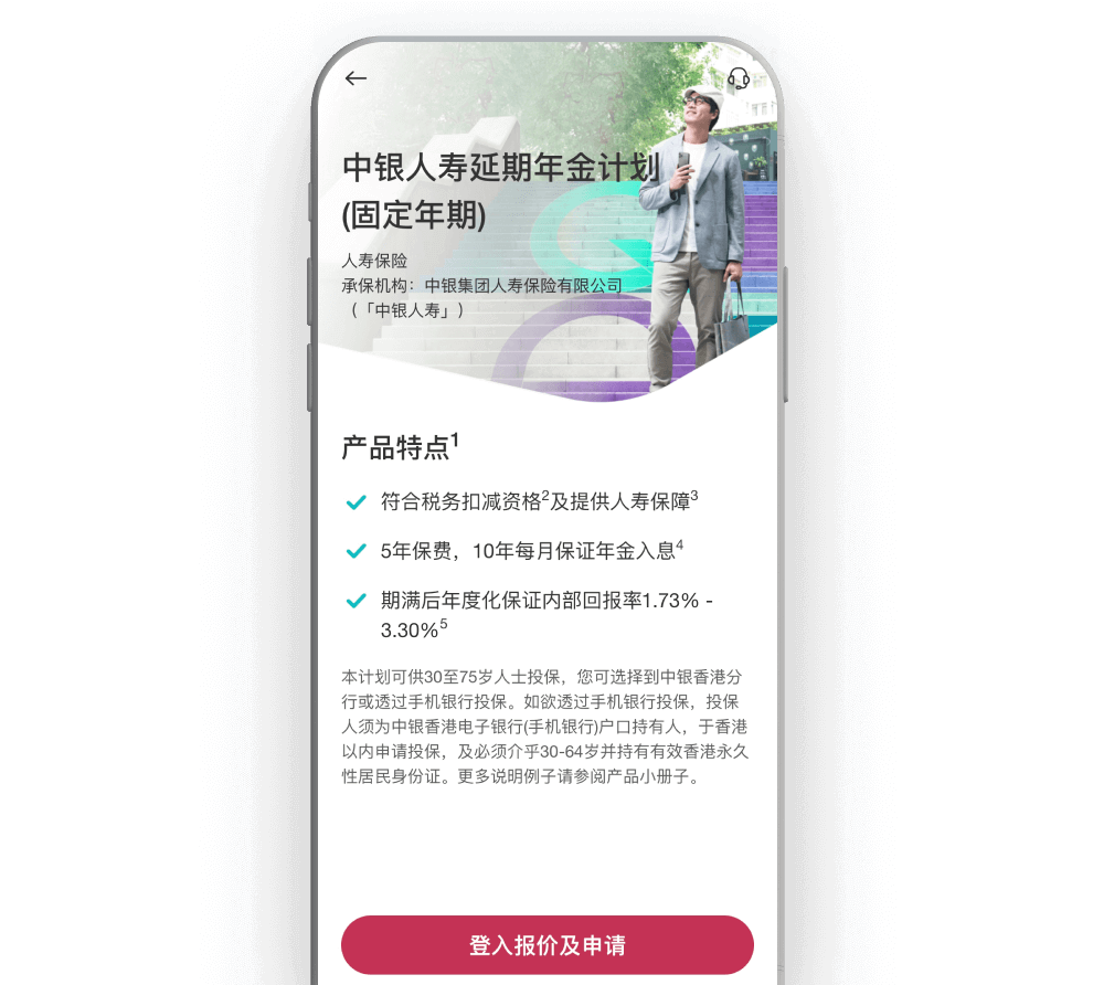 注:本计划只供中银香港电子银行(手机银行)户口持有人于香港以内申请投保。投保人必须介乎30-64岁并持有有效香港永久性居民身份证。