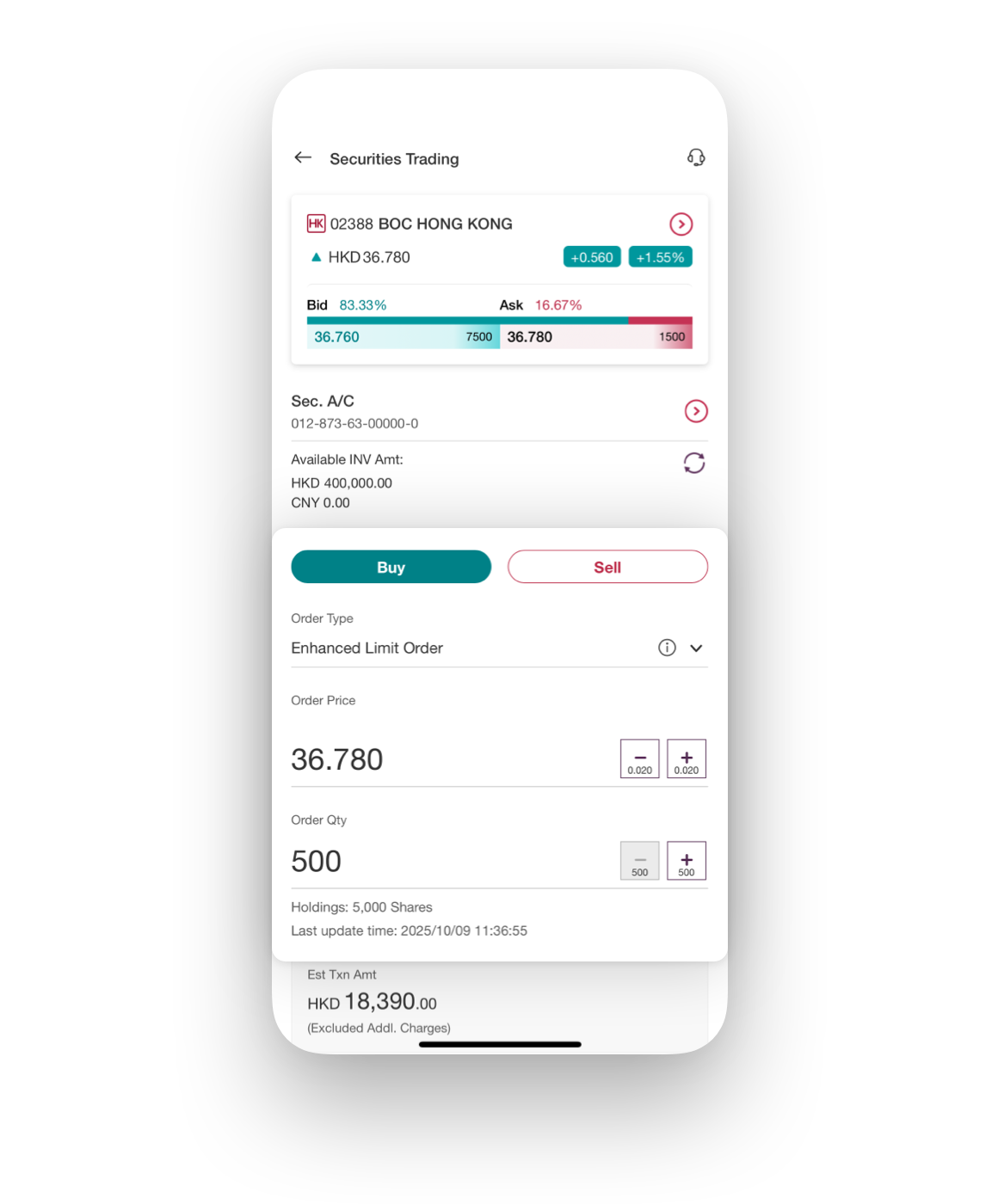 BOCHK’s multiple channels provide various order types including Good Till Date Order, Enhanced Limit Order, Market Order, At-auction Limit Order and At-auction Order (Applicable to Sell Order Only)