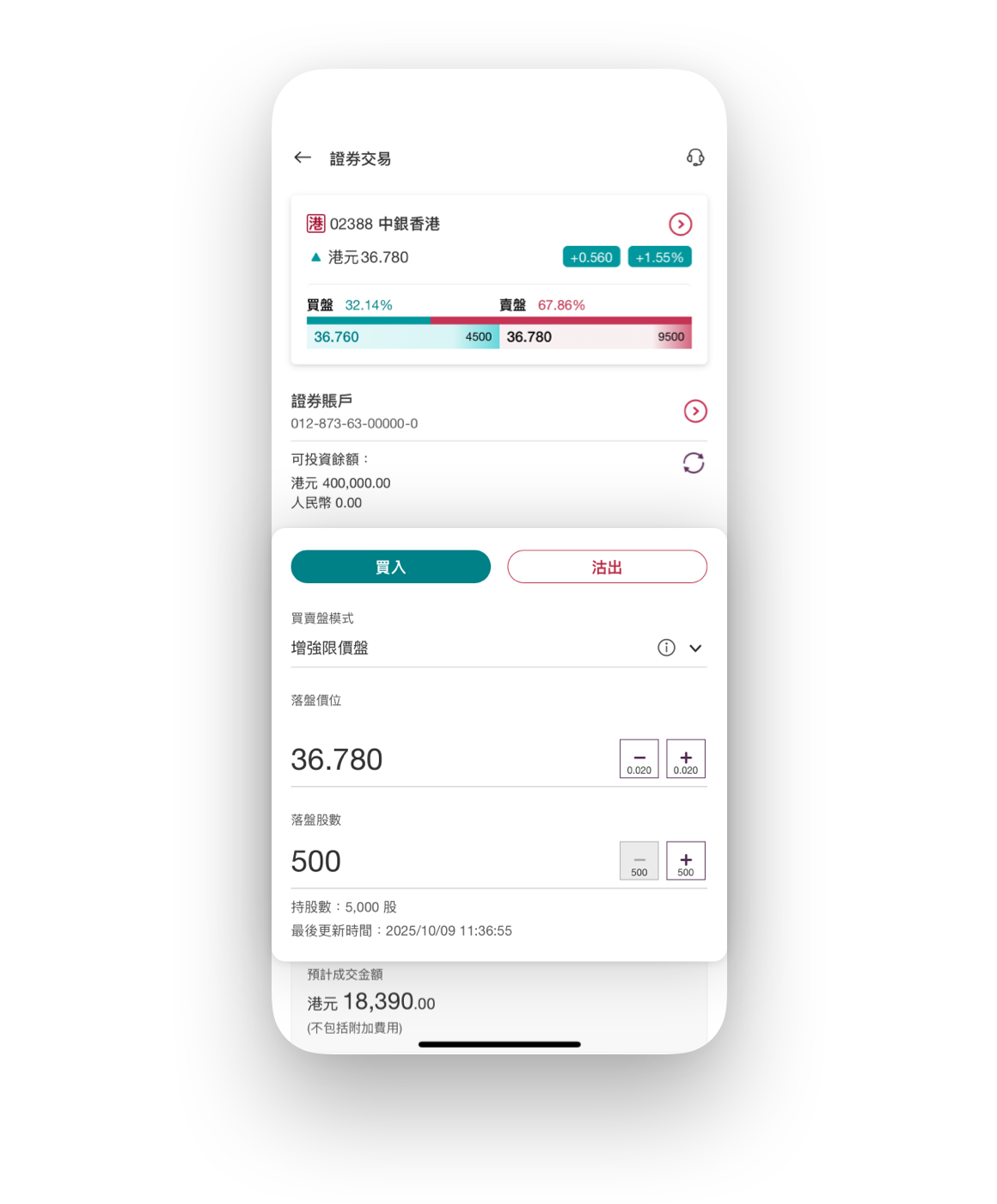 於交易版面輸入想買賣的股票代號後,您可以看到該股票的免費實時串流報價,選擇「買入/沽出」及「增強限價盤/市盤」,版面會自動顯示交易股數/交易價格,您可按需要調整