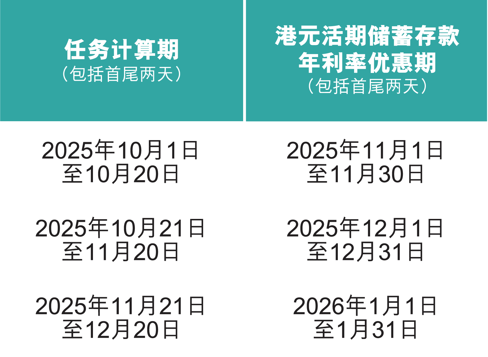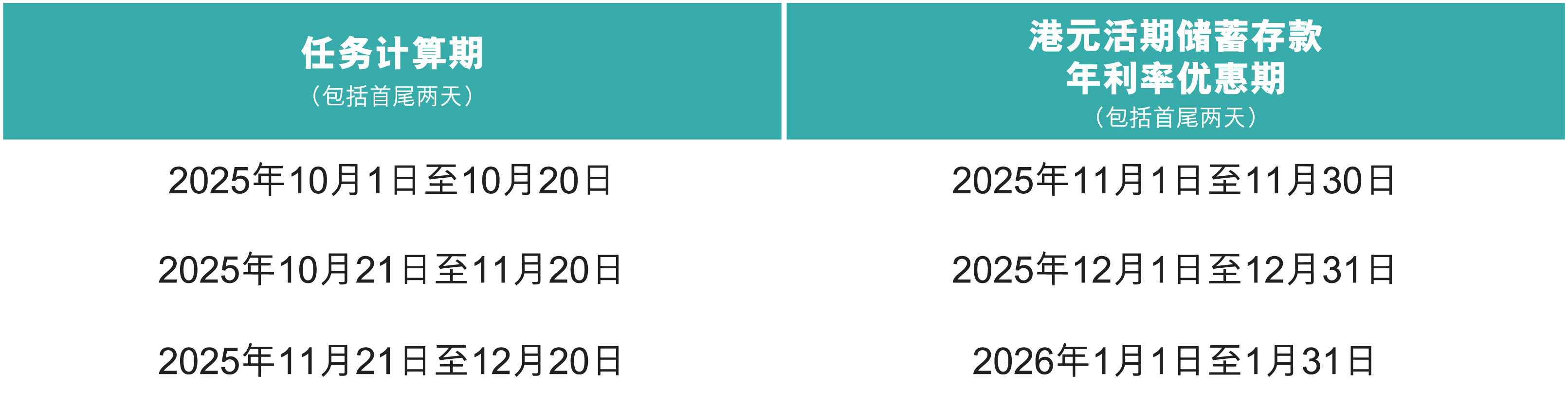 註:以上为2025年10月1日公佈的港币特优定期存款年利率,仅供参考,实际年利率将根据中银香港不时公佈的为准。每笔定期存款只可享此优惠一次,日後续期的利率将根据中银香港不时公佈的为准。