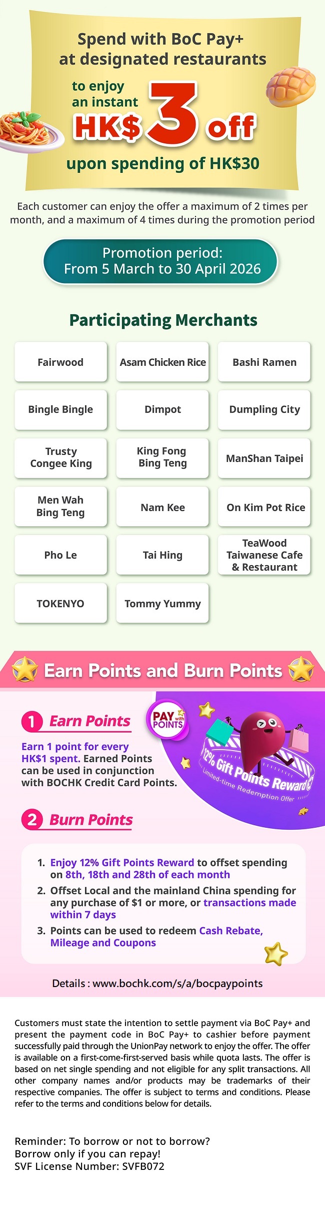 > Spend with BoC Pay+ at designated restaurant to enjoy an instant HK$3 off upon spending of HK$30!