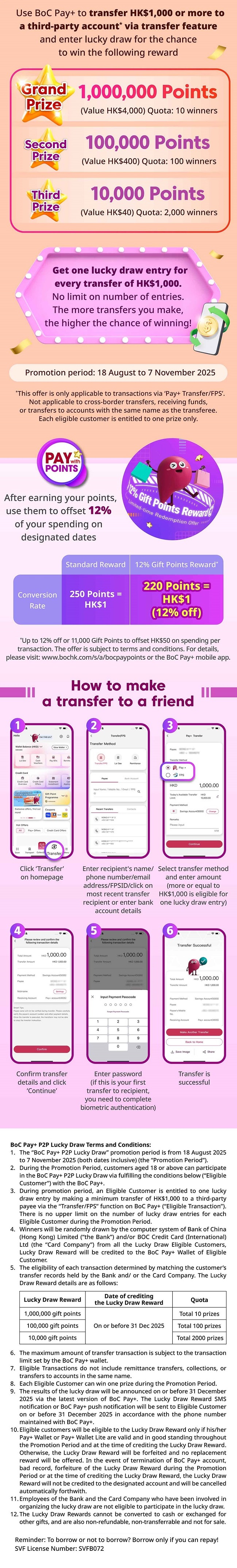 > Transfer via BoC Pay+ to join Lucky Draw, win up to 1M Gift Points