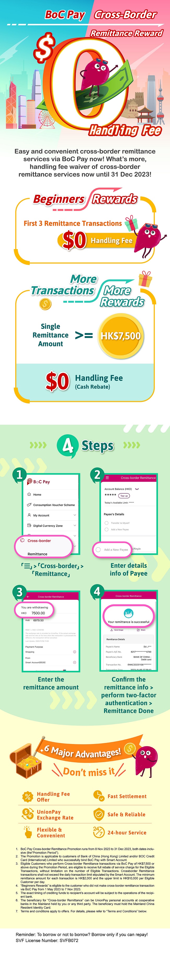 3. Eligible customers who perform Cross-border Remittance transactions of HK$7,500 or above during the Promotion Period via BoC Pay, are eligible to receive 100% service fee rebate (the “Rebate”) for the transactions;
