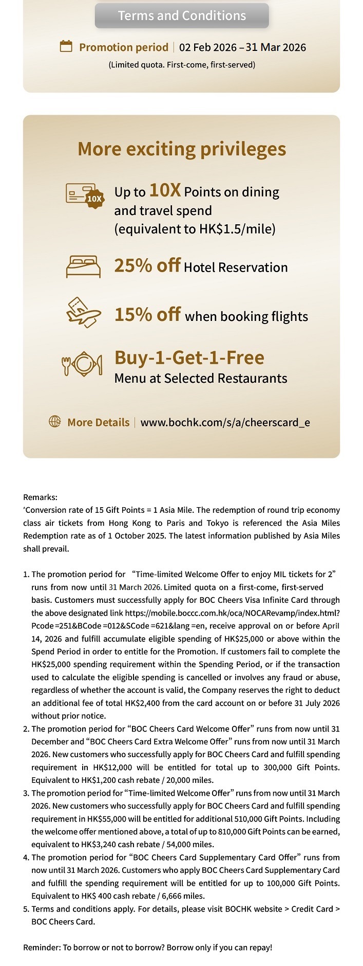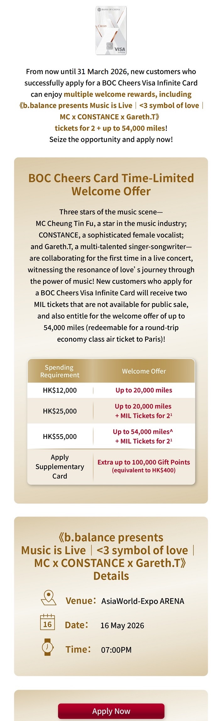> Apply BOC Cheers VI Card to get 2 MIL tickets