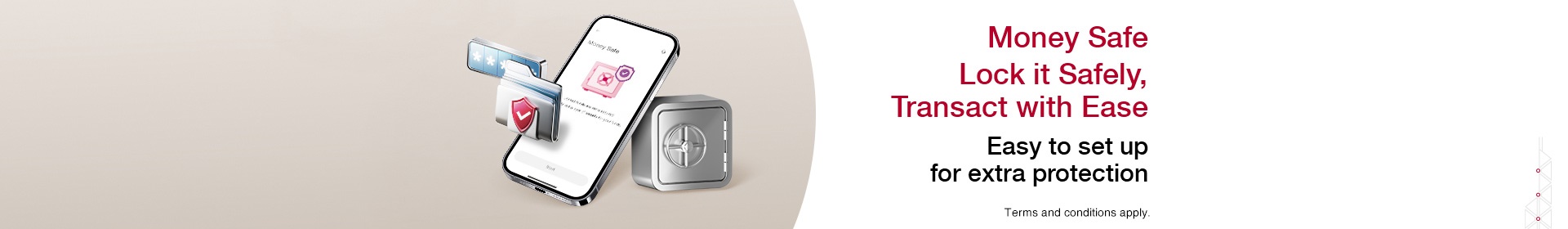 *(but not applicable to current accounts with overdraft limit and any overdraft limit) - If you have a time deposit, you can lock the time deposit so that all the funds in the selected time deposit cannot be withdrawn through Internet Banking or Mobile Banking. Please note that Money Safe is not applicable to time deposits pledged to our Bank or time deposits that are subject to our Bank’s overriding rights (e.g. enforcement, set off etc.) or time deposits with maturity instructions of crediting principal and interest to a different name account or a third party’s account. If a time deposit has been locked under Money Safe, it cannot be used as collateral for "Wealth Portfolio Financing" and “General Banking facilities and loan facility(ies)” service and our Bank reserves the right to ask for additional collateral. Money Safe is not applicable to overdue time deposits or time deposits which will be matured on the date of application of Money Safe.