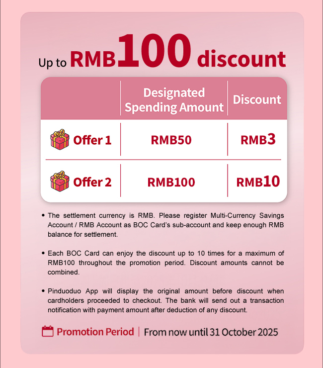 Cardholders who proceed to checkout on Pinduoduo App, choose “UnionPay QuickPass/Apple Pay” which bind with BOC Card and complete the payment, can enjoy instant discount up to RMB100!