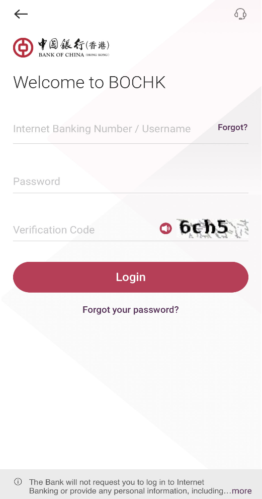 Please input Internet Banking number/username, password and verification code, then press “Login”You may choose to enable “Biometric Authentication” (e.g. fingerprint, Face ID) with Mobile Token to log in Mobile Banking.