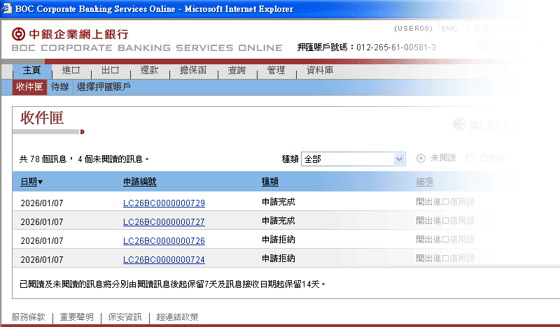 用戶可透過「中銀企業網上銀行」內的貿易服務版面,辦理及查詢進口、出口、擔保函、備用信用證或還款等交易。