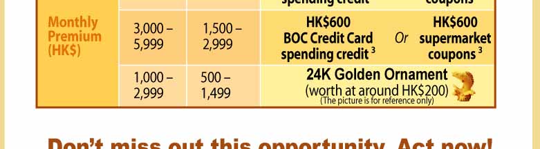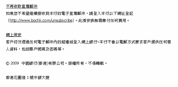 According to the Personal Data (Privacy) Ordinance, customers may, at any time, choose not to receive our promotional materials. To notify us, please contact any branches of Bank of China (Hong Kong) or call our Customer Service Hotline at (852) 233 233 28. No fee will be charged for this arrangement. Please do not reply to this message. For enquiries, please contact us at (852) 233 233 28 or e-mail to enquiry_csc@bochk.com. |