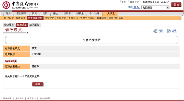 更改电子结单设定的程序已完成,有关指示将于下一个工作天生效。