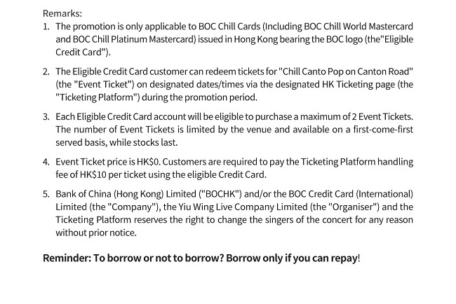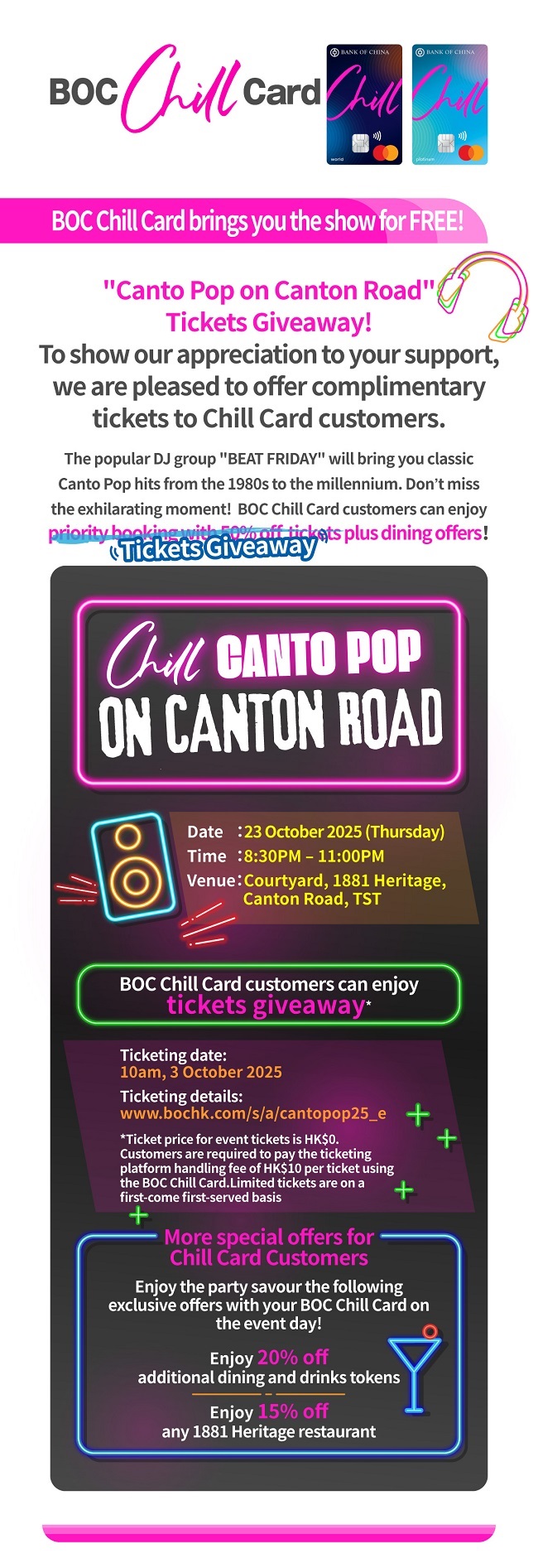 *Ticket price for event tickets is HK$0. Customers are required to pay the ticketing platform handling fee of HK$10 per ticket using the BOC Chill Card.