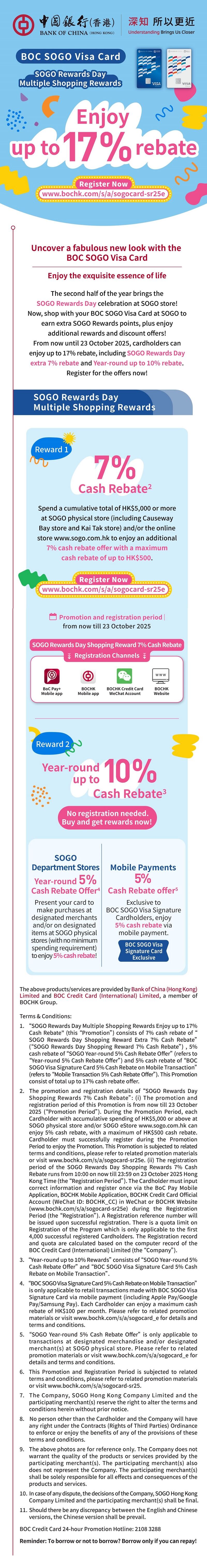 For terms and conditions of "SOGO Rewards Day Shopping Reward Extra 7% Cash Rebate",please refer here.