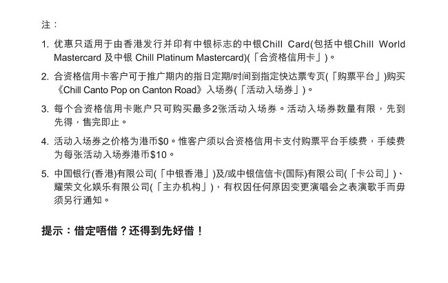 *活动門票之價格為港幣$0。惟客戶須以中銀Chill Card支付購票平台手續費,手續費為每張門票港幣$10。