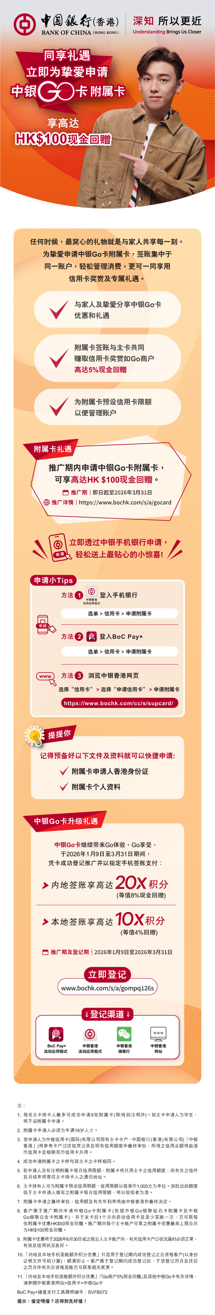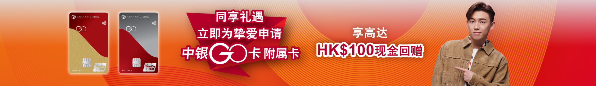 > 【中银Go卡】申请附属卡享高达HK$100现金回赠