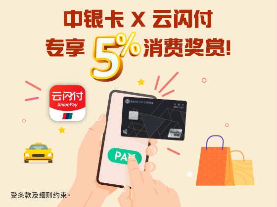 推广期内持卡人以绑定中银卡的云闪付,在商户进行任何消费交易,即可享5%消费奖赏!