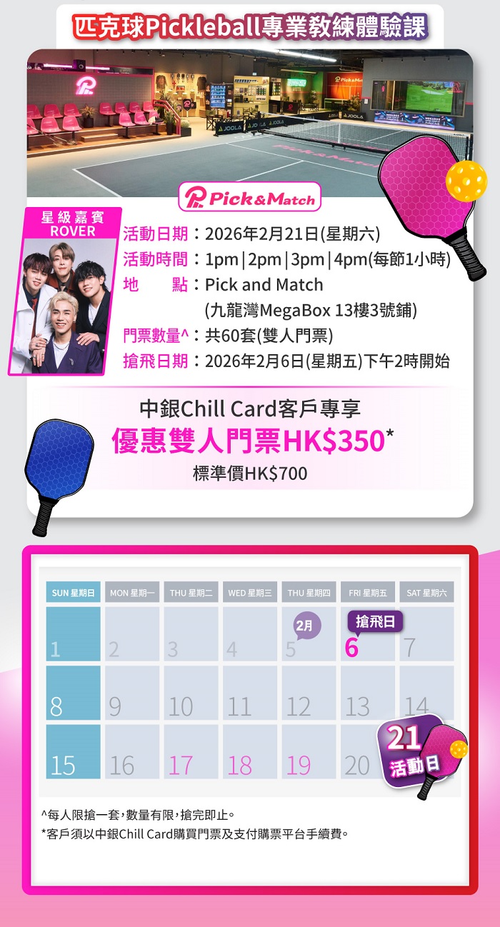*電影/音樂會門票之價格為港幣$0。惟客戶須以中銀Chill Card支付購票平台手續費,手續費為每張門票港幣$10。