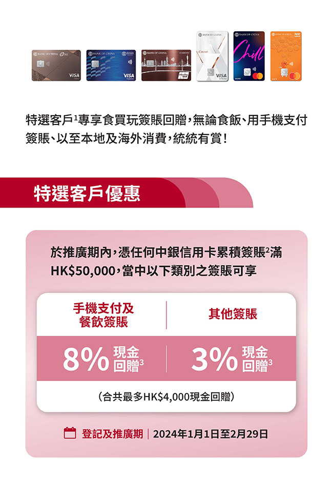 1. 中銀信用卡「特選客戶簽賬推廣」(下稱「本推廣」)只適用於收到此推廣之電郵及/或短訊之特選客戶(下稱「客戶」);只適用於由香港發行並印有中銀標誌的中銀信用卡、中銀雙幣卡及中銀聯營卡(下稱「合資格信用卡」),但不適用於由內地及澳門發行的中銀信用卡、私人客戶卡、採購卡及美金卡。