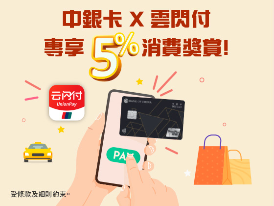 推廣期內持卡人以綁定中銀卡的雲閃付,在商戶進行任何消費交易,即可享5%消費獎賞!