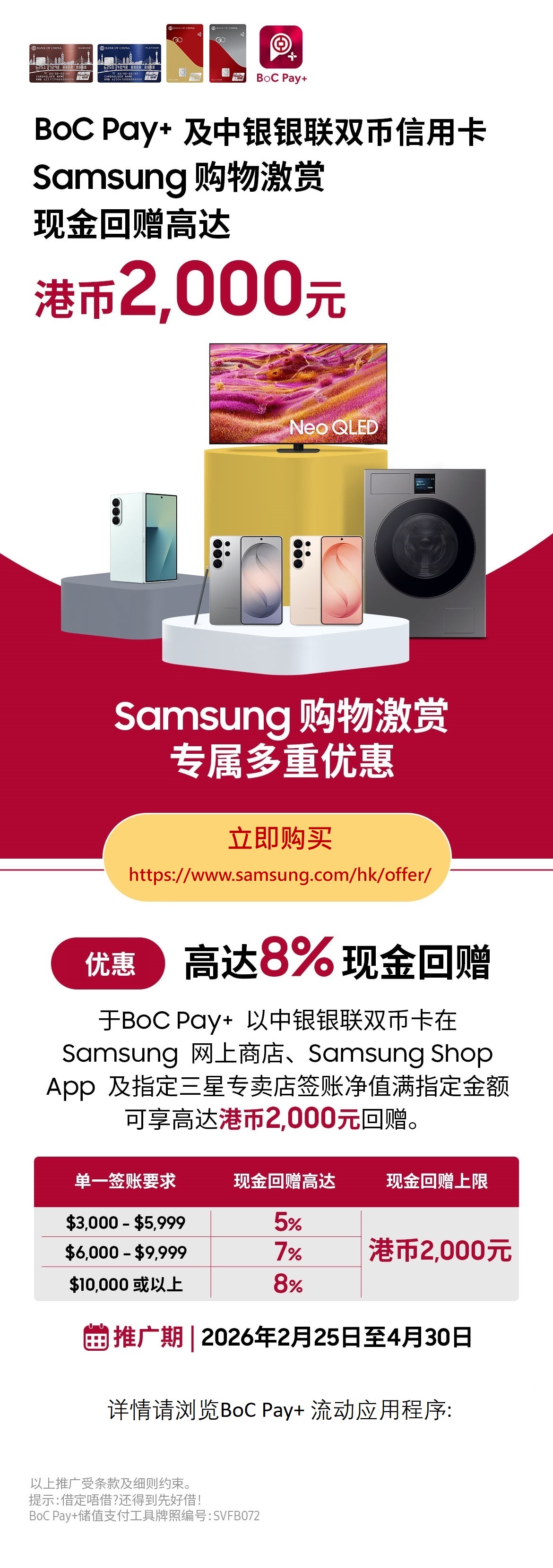 > 用BoC Pay+ 享Samsung 购物激赏,现金回赠高达港币2,000元!