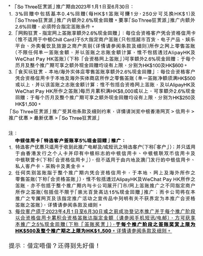 中银信用卡「特选客户签账享 5%现金回赠」推广之条款及细则
