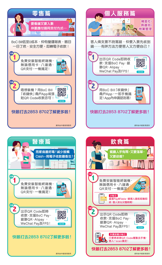 「BoC Bill 綜合收款服務」是一項專為商戶而設的綜合線上線下收款及交易管理服務,處理包括 Visa、MasterCard、銀聯、美國運通、 JCB 、Discover 及 Diners各種銀行卡支付,以及處理本港非接觸式 BoC Pay、雲閃付、微信支付、支付寶、轉數快、Visa payWave、MasterCard PayPass、銀聯閃付、八達通卡、Apple Pay 、Google Pay 、Samsung Pay 、 Huawei Pay 及 Tap & Go 拍住賞* 收款服務,並具備收款、退款對賬等理財功能,可以安全地接受多種支付方案,幫你輕鬆處理商舖日常營運。