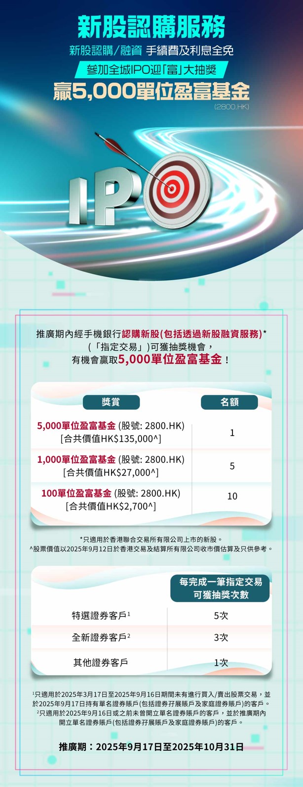 * 由2025年10月1日至2025年12月31日內(「推廣期」)開始招股的新股,豁免新股認購手續費港幣100元。
