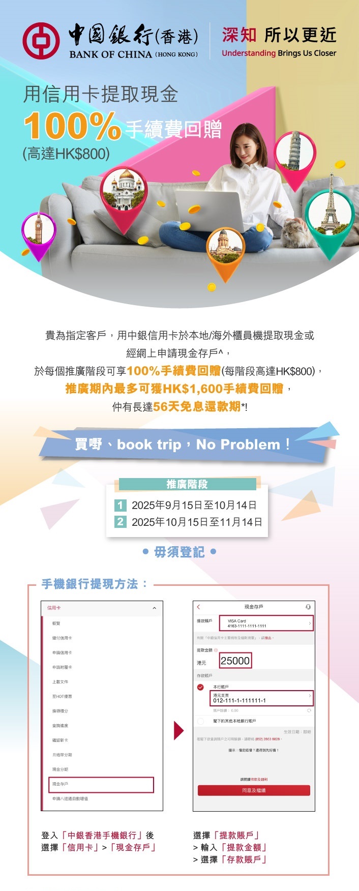 3. 指定客戶憑名下所有合資格信用卡主卡港幣賬戶,於推廣期內透過「現金透支/現金存戶」提取現金(下稱「合資格交易」)可享100%手續費回贈優惠。