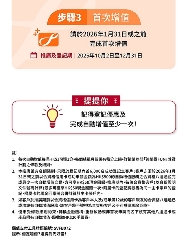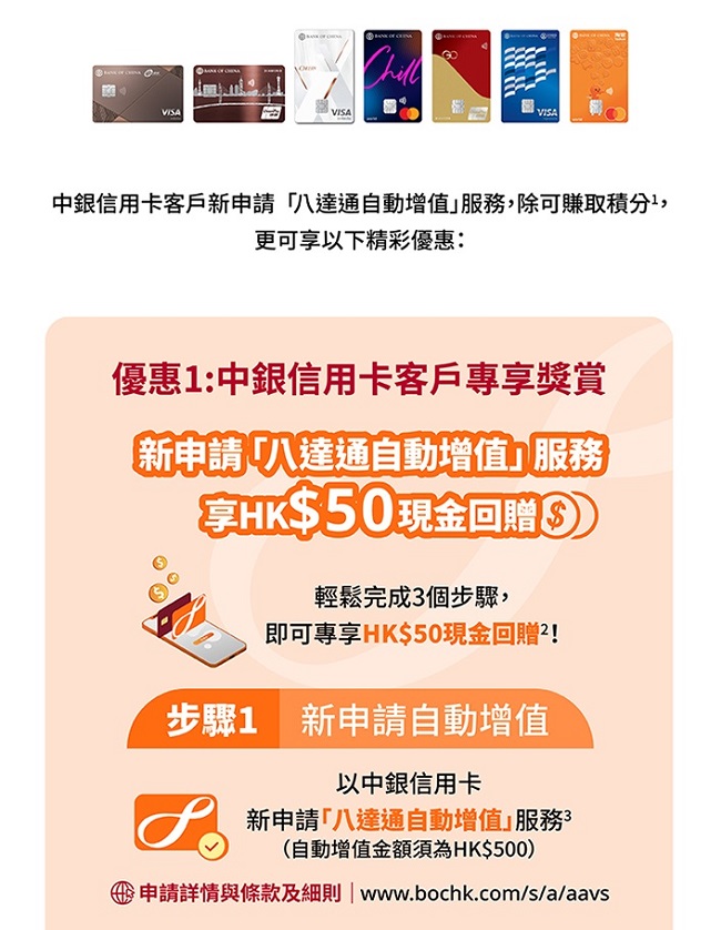 > 新申請『八達通自動增值』服務享HK$50現金回贈