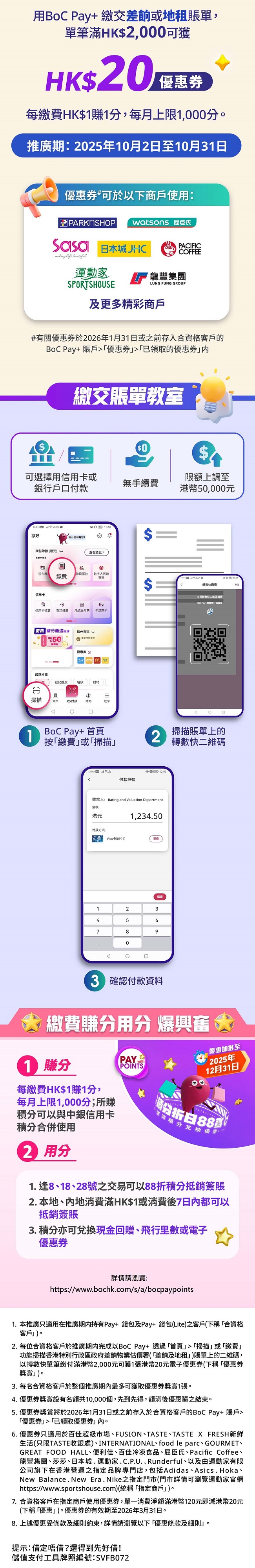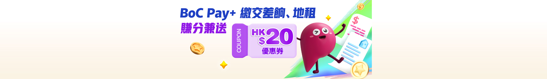 > 用BoC Pay+ 交差餉、地租,賺港幣20元優惠券!