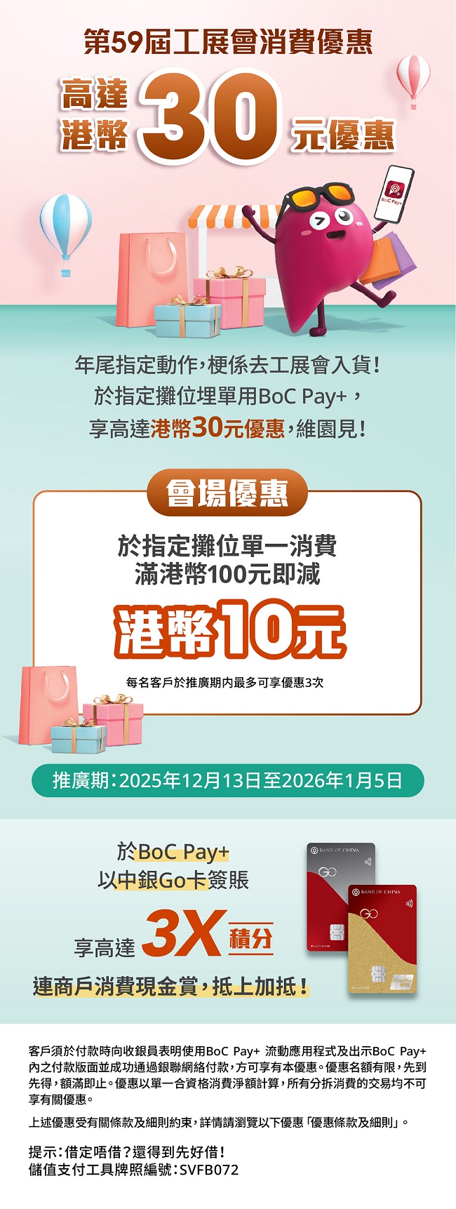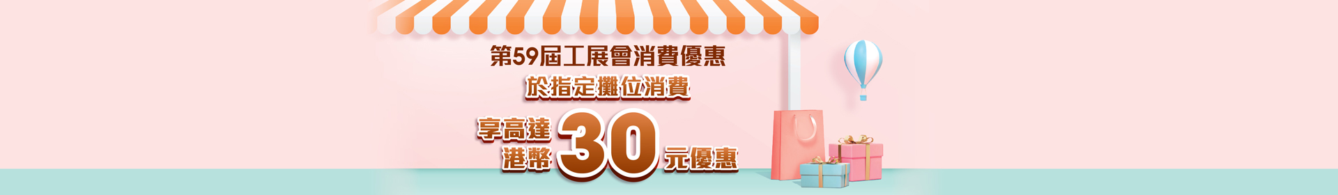 > 於工展會指定攤位消費享高達港𢄞30元優惠!