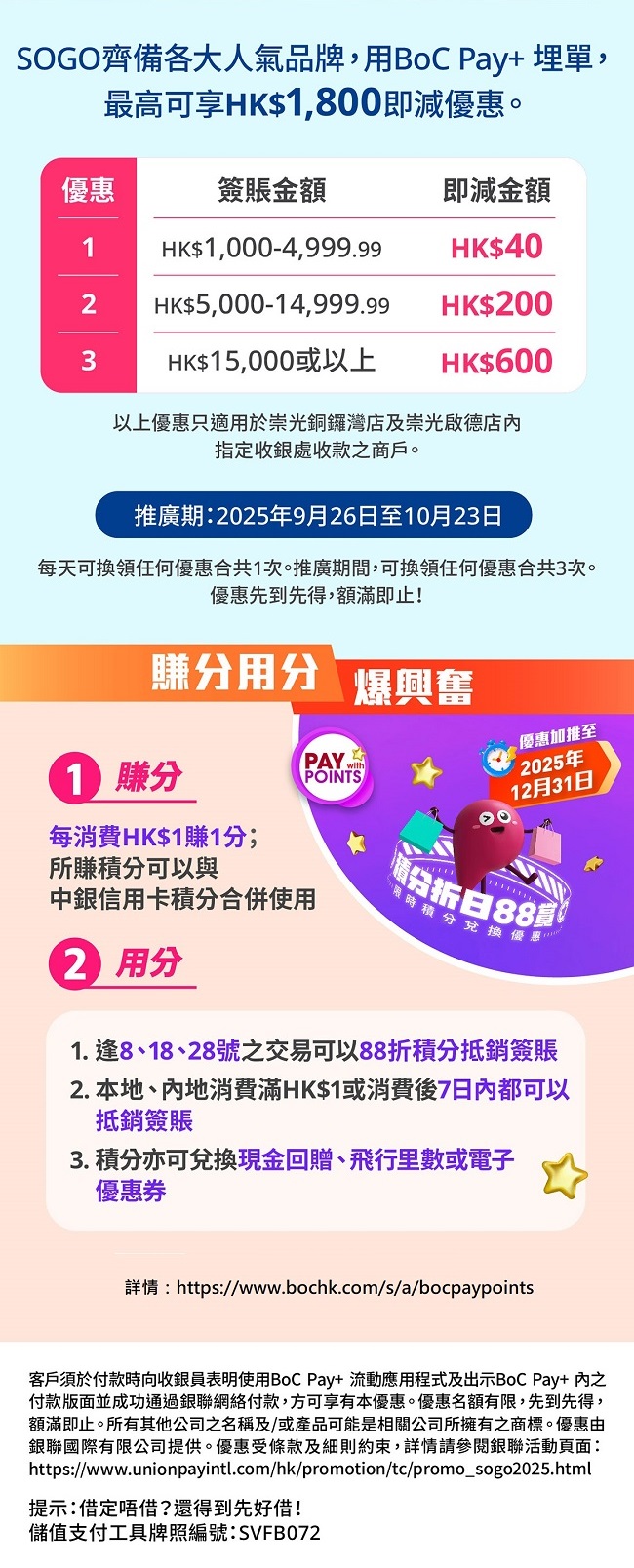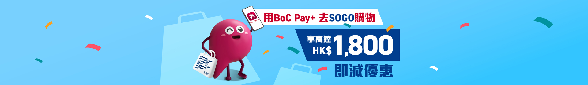 > 用BoC Pay+ 去SOGO購物享高達HK$1,800即減優惠!
