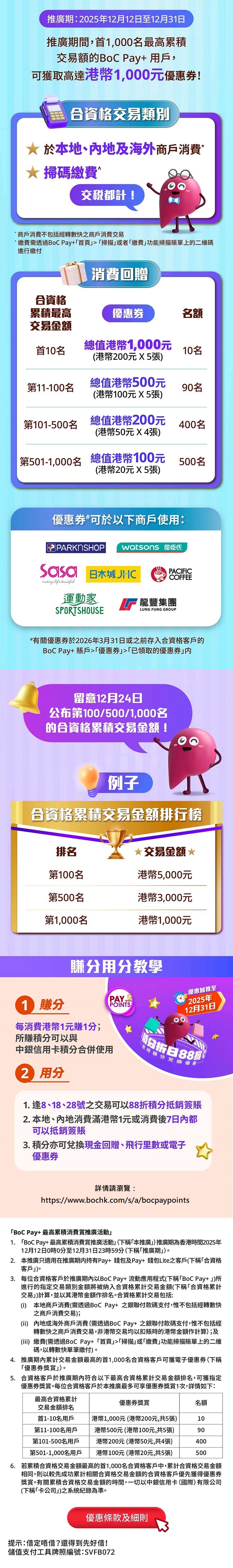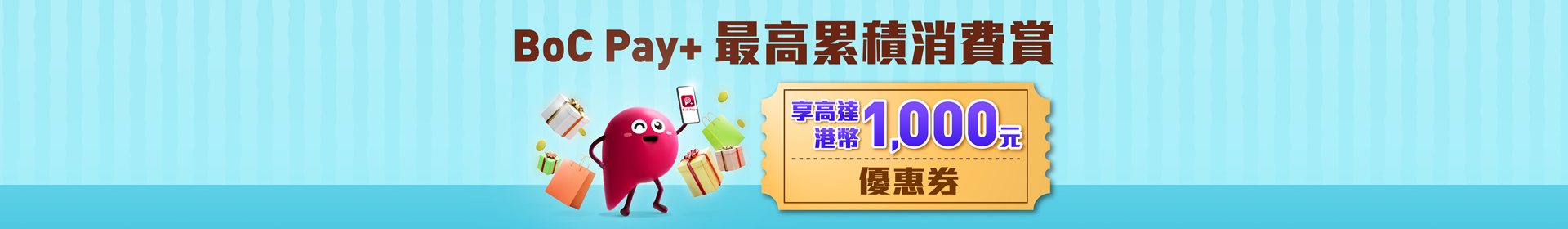 > 經BoC Pay+ 完成合資格交易,可獲高達港幣1,000元優惠券!