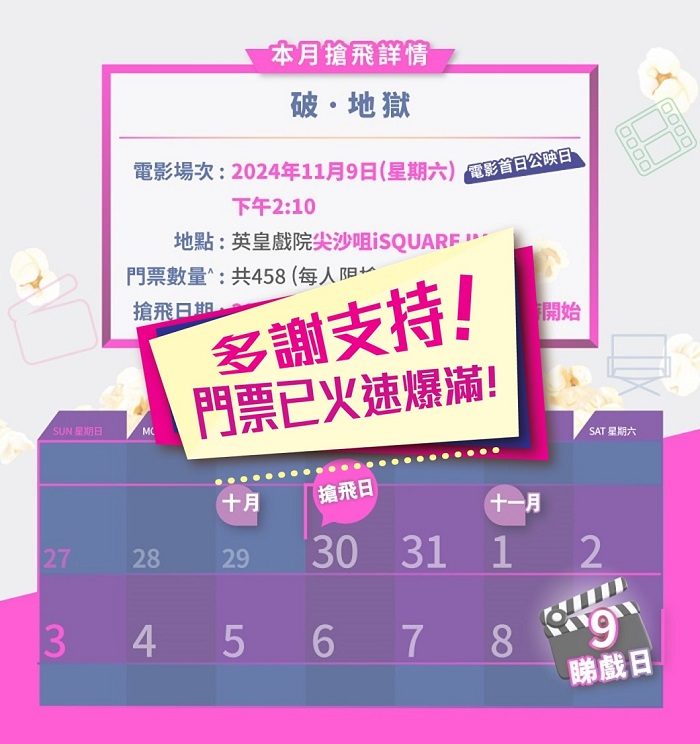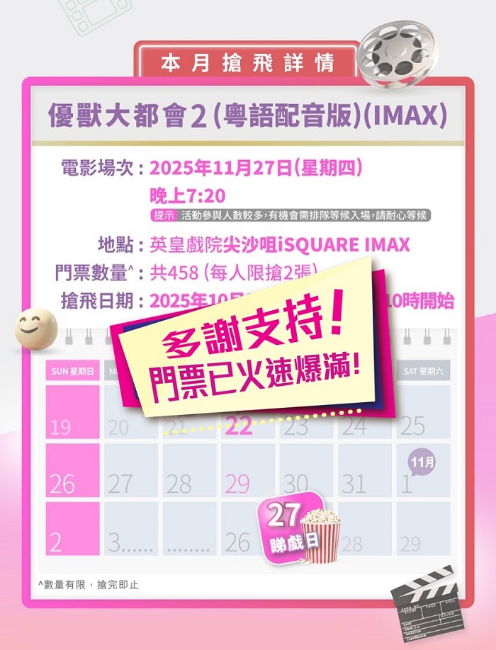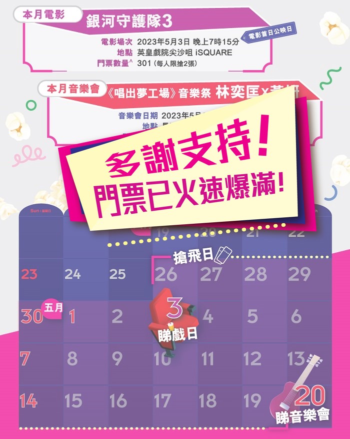 *電子門票價格為港幣$0。惟客戶須以合資格信用卡支付購票平台每張電子門票手續費港幣$5。