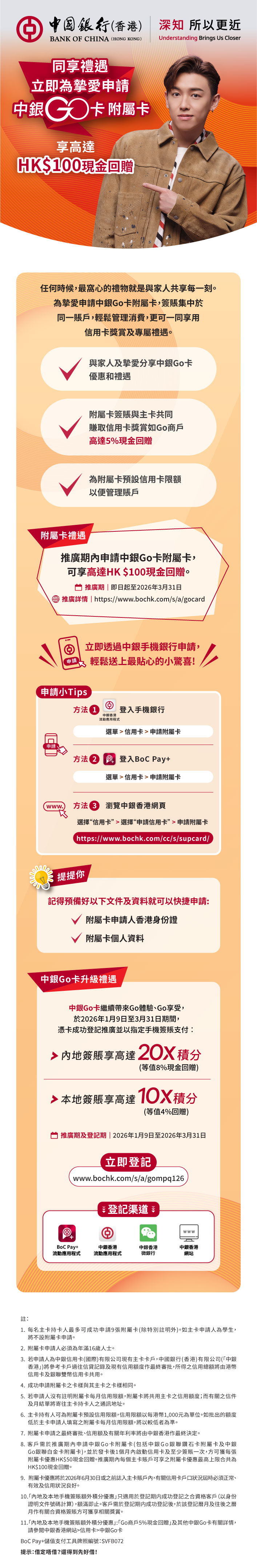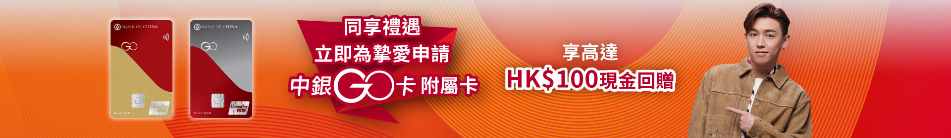 > 【中銀Go卡】申請附屬卡享高達HK$100現金回贈!