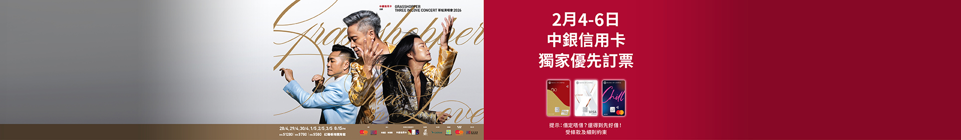 > 中銀信用卡獨家優先訂票:草蜢THREE IN LOVE CONCERT演唱會2026