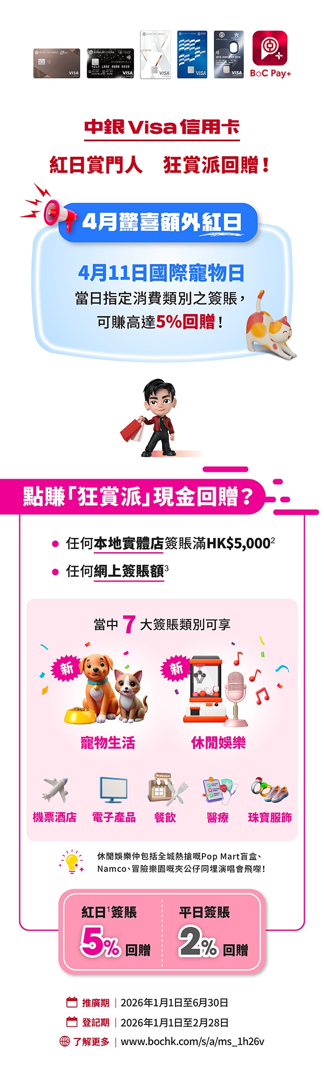 主頁 >  信用卡 >  推廣優惠 >  最新優惠 >  「狂賞派」4月額外驚喜紅日賺高達5%回贈!