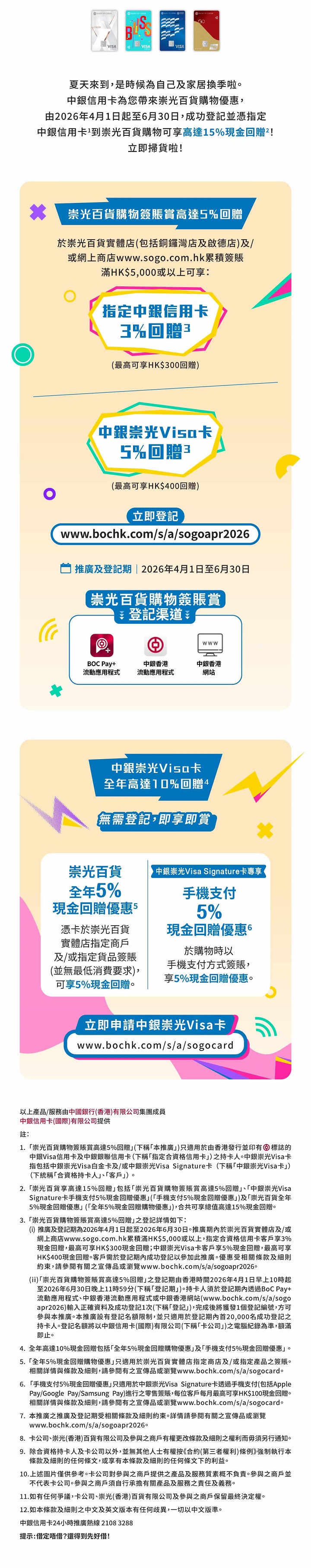 > 【中銀信用卡】 崇光百貨購物簽賬賞享高達15%回贈