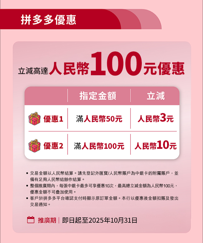 3) 中銀卡持卡人在拼多多APP下單並完成線上支付,單一消費滿上述指定金額,可享高達人民幣10元優惠。
